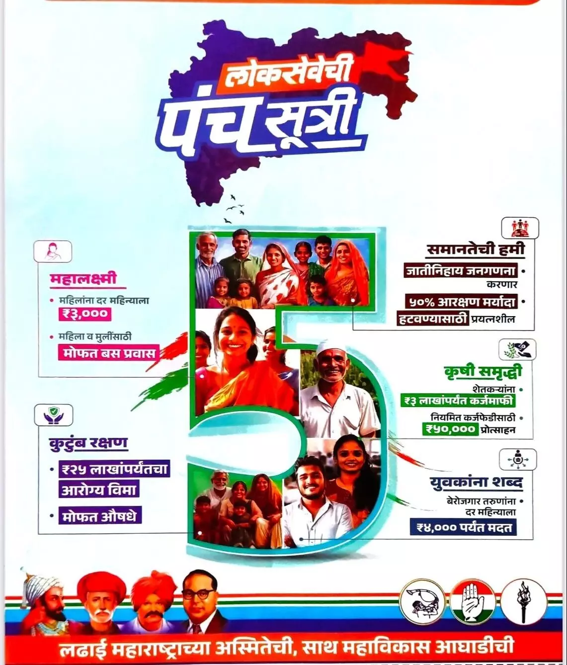 |Maharashtra Assembly Election 2024 : महाराष्ट्र। महाविकास अघाड़ी गठबंधन ने महाराष्ट्र विधानसभा चुनाव के लिए अपना घोषणापत्र जारी कर दिया है। महाविकास अघाड़ी ने जनता को पांच गारंटियां दी हैं। जारी किए गए घोषणापत्र में महिलाओं समेत किसानों पर फोकस किया है। यह घोषणा पत्र मुंबई में महाविकास अघाड़ी की महाराष्ट्र स्वाभिमान सभा में कांग्रेस नेता राहुल गांधी और गठबंधन के अन्य नेताओं की मौजूदगी में घोषणा पत्र जारी किया गया है।