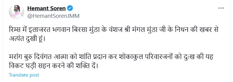 झारखंड के सीएम हेमंत सोरेन ने बिरसा मुंडा के वंशज मंगल मुंडा के निधन पर शोक व्यक्त किया है। सीएम सोरेन ने कहा कि, रिम्स में इलाजरत भगवान बिरसा मुंडा के वंशज श्री मंगल मुंडा जी के निधन की खबर से अत्यंत दुखी हूं। मरांग बुरु दिवंगत आत्मा को शांति प्रदान कर शोकाकुल परिवारजनों को दुःख की यह विकट घड़ी सहन करने की शक्ति दें।