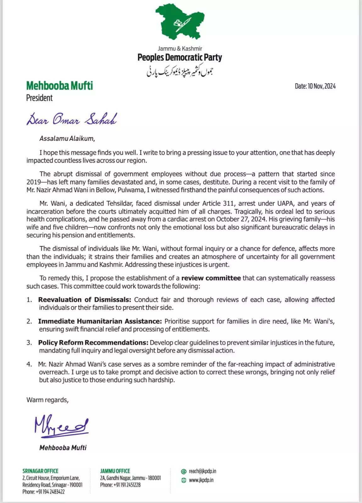 महबूबा मुफ्ती ने पत्र में लिखा, डियर उमर साहब, मैं एक चर्चित मुद्दे को आपके ध्यान में लाने के लिए पत्र लिख रही हूँ, जिसने हमारे क्षेत्र में अनगिनत लोगों के जीवन को गहराई से प्रभावित किया है। बिना उचित प्रक्रिया के सरकारी कर्मचारियों को अचानक बर्खास्त कर दिया जाना, एक ऐसा पैटर्न है जो 2019 से शुरू हुआ है - जिसने कई परिवारों को तबाह कर दिया है और बेसहारा कर दिया है। हाल ही में बेलो, पुलवामा में नजीर अहमद वानी के परिवार से मिलने के दौरान। मैंने इस तरह की कार्रवाइयों के दर्दनाक परिणामों को प्रत्यक्ष रूप से देखा।