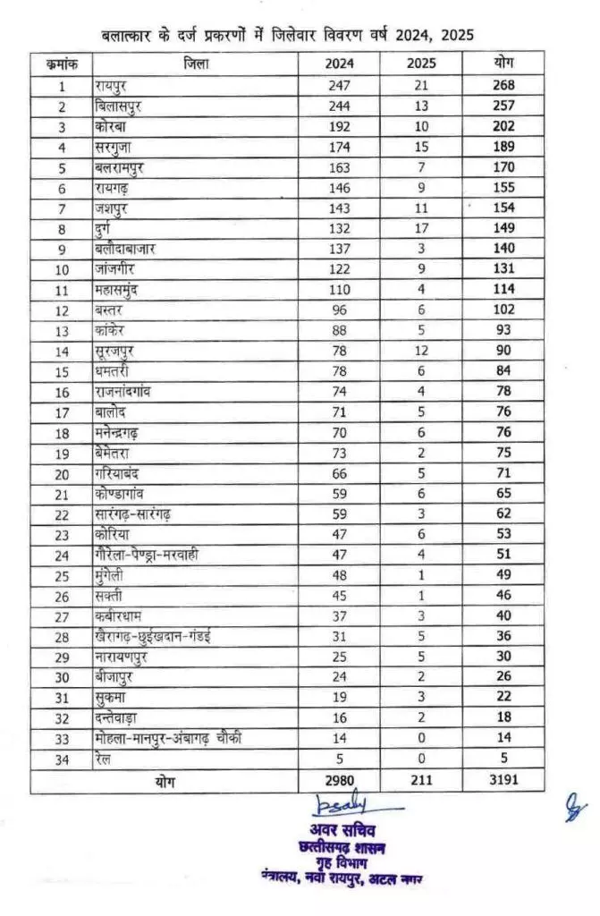 इन सब आंकड़ों में बलात्कार के आंकड़े सबसे ज्यादा चौंकाने वाले हैं। प्रदेश में एक साल के भीतर बलात्कार के 3191 केस दर्ज किए गए हैं। इस हिसाब से रोज प्रदेश में 8 से 9 महिलाएं हवस का शिकार बन रही हैं। वहीं सबसे ज्यादा बलात्कार के मामले रायपुर सबसे आगे है।