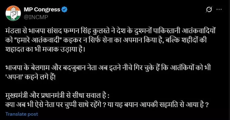मध्य प्रदेश कांग्रेस अध्यक्ष जीतू पटवारी ने इस बयान का वीडियो सोशल मीडिया प्लेटफॉर्म 'एक्स' पर शेयर करते हुए बीजेपी पर निशाना साधा। उन्होंने लिखा, "बीजेपी के कैबिनेट मंत्री विजय शाह और डिप्टी सीएम जगदीश देवड़ा के बाद अब पूर्व केंद्रीय मंत्री और मंडला से बीजेपी सांसद फग्गन सिंह कुलस्ते ने आतंकियों को 'अपना' कह दिया!