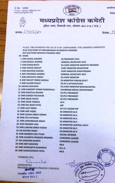 |भोपाल। प्रदेश में उपचुनाव के लिए दोनों मुख्य राजनीतिक दल पूरे दम-ख़म से चुनाव प्रचार में जुटे हुए है। बीते दिनों चुनाव प्रचार के लिए भाजपा द्वारा स्टार प्रचारकों की सूची जारी करने के बाद आज कांग्रेस ने भी स्टार प्रचारकों की सूची जारी कर दी। जिसमें कांग्रेस के पूर्व राष्ट्रीय अध्यक्ष राहुलगांधी, राष्ट्रीय महासचिव प्रियंका गांधी, छत्तीसगढ़ के मुख्यमंत्री भूपेश बघेल, राजस्थान के सीएम अशोक गहलोत , सचिन पायलट, नवजोत सिंह सिद्दू आदि बतौर स्टार प्रचारक चुनाव प्रचार करेंगे। इसी सूची में बड़े स्तर पर प्रदेश के स्थानीय नेताओं को शामिल किया गया है।