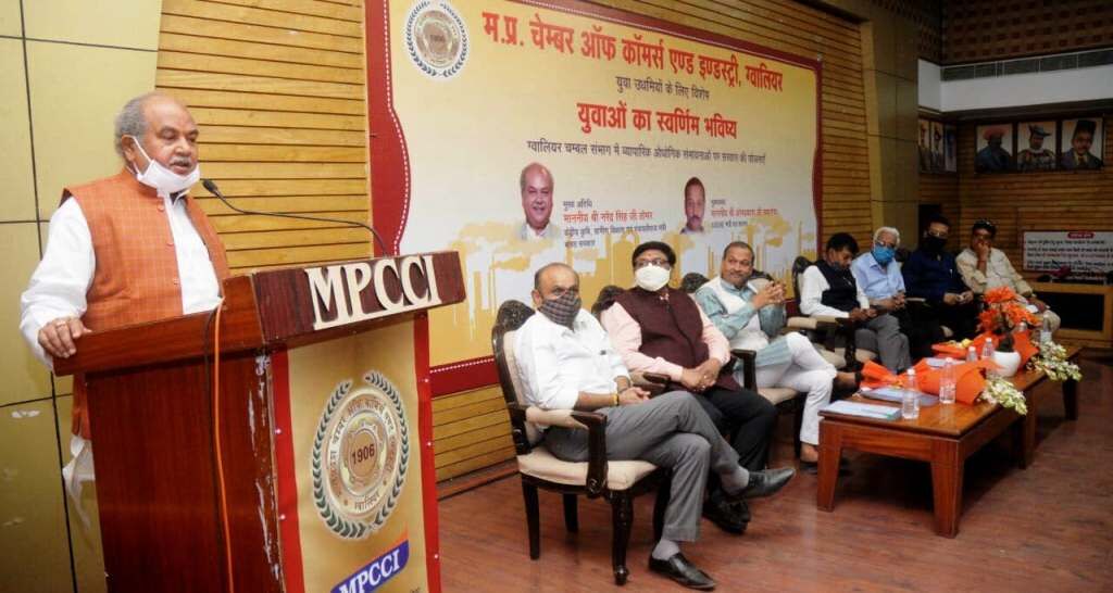 ग्वालियर, न.सं.। हमें अपनी विरासत पर गर्व होना चाहिए। यदि हम उस पर गर्व करें तो समस्याओं का निदान हो जाता है। कोरोना महामारी को अवसर में बदलने की सोच प्रधानमंत्री नरेन्द्र मोदी जी ने हमें दी है। लॉकडाउन में जब सभी कंपनियां बंद हो गई थी, तब लोकल ब्राण्ड ने ही जिंदा रखा था। हमें अपने लोकल को हीनभावना से नहीं देखना चाहिए बल्कि उसे प्रोत्साहित करना चाहिए। पलायन भूख से हो तो अभिशाप है पर यदि यह उन्नति के लिए हो तो शुभ संकेत है और यह होना भी चाहिए। यह बात मुख्य अतिथि की आसंदी से केन्द्रीय मंत्री नरेन्द्र सिंह तोमर ने कही। अवसर था मध्य प्रदेश चेम्बर ऑफ कॉमर्स में व्यापारिक एवं औद्योगिक संभावनाओं पर युवा उद्यमियों के लिए युवाओं के स्वर्णिम भविष्य विषय पर सेमीनार का। इस अवसर पर मुख्य वक्ता के रूप में एमएसएमई मंत्री ओमप्रकाश सखलेचा उपस्थित थे। स्वागत भाषण चेम्बर अध्यक्ष विजय गोयल ने दिया।