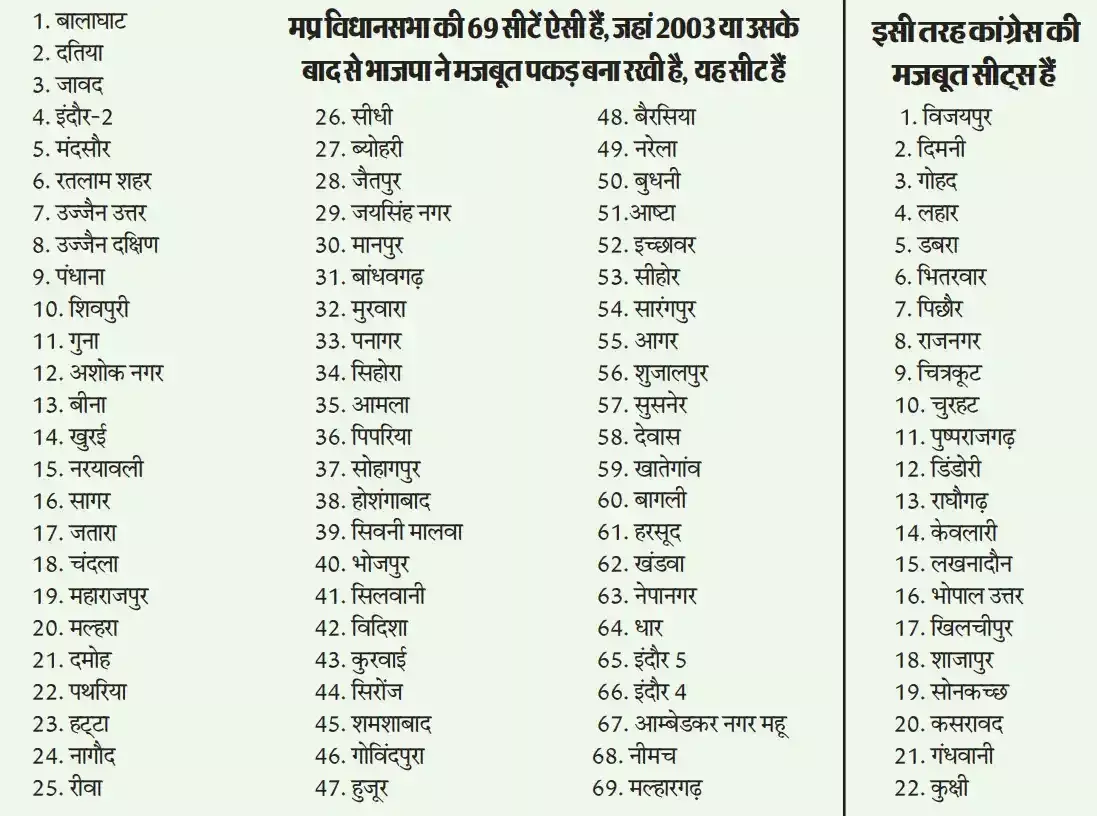 मप्र विधानसभा के लिए निर्णायक लड़ाई 139 सीट्स पर होती नजर आ रही है, क्योंकि 91 सीट्स ऐसी हैं, जहां दोनों पार्टियों ने अपनी-अपनी पकड़ काफी मजबूत बना रखी है। 2003 से 2018 के चार चुनावों का नतीजों के आधार पर विश्लेषण करें तो यह साफ होता है कि इन 91 सीट्स में से 69 सीटें ऐसी हैं, जिन पर भाजपा का प्रदर्शन बहुत अच्छा बना हुआ है। कुछ सीट्स तो ऐसी हैं, जहां 1993 और 1998 से कांग्रेस को जीत नसीब नहीं हुई है। शिवपुरी, गुना, इंदौर 4, इंदौर 2, सागर, भोजपुर, बैरसिया, गोविंदपुरा, उज्जैन, रतलाम इनमें शामिल हैं, वहीं पिछौर, राघौगढ़, लहार जैसी सीट्स पर कांग्रेस भी लगातार 1993 से जीतती आ रही है। 2023 का राजनीतिक परिदृश्य इन सीट्स पर बहुत बड़ा उलटफेर करेगा। इसकी संभावना फिलवक्त नजर नहीं आ रही है। ऐसे में सत्ता की लड़ाई का निर्णायक केंद्र बची हुई 139 सीट ही रहने वाली हैं।