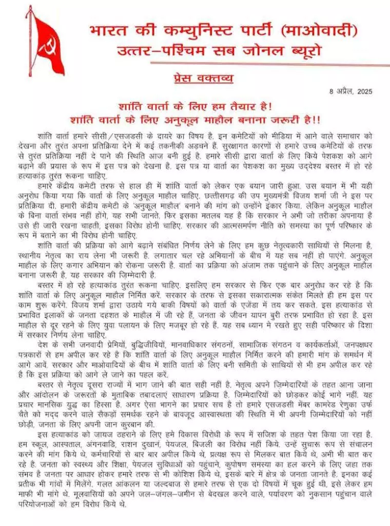 इससे पहले केंद्रीय गृह मंत्री अमित शाह के हालिया छत्तीसगढ़ दौरे से ठीक पहले भारतीय कम्युनिस्ट पार्टी (माओवादी) केंद्रीय समिति ने तेलुगु में शांति वार्ता का प्रस्ताव पेश किया था। अब उत्तर-पश्चिम सब जोनल ब्यूरो ने हिंदी में नया बयान जारी कर इस मुद्दे को आगे बढ़ाया है।