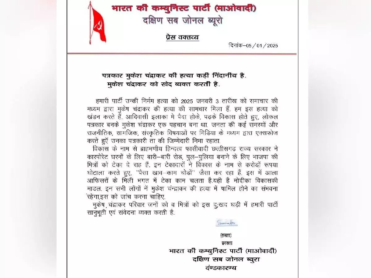 Mukesh Chandrakar Murder: पत्रकार मुकेश चंद्राकर हत्याकांड मामले में नक्सलियों की एंट्री, प्रेस नोट जारी कर की ये मांग