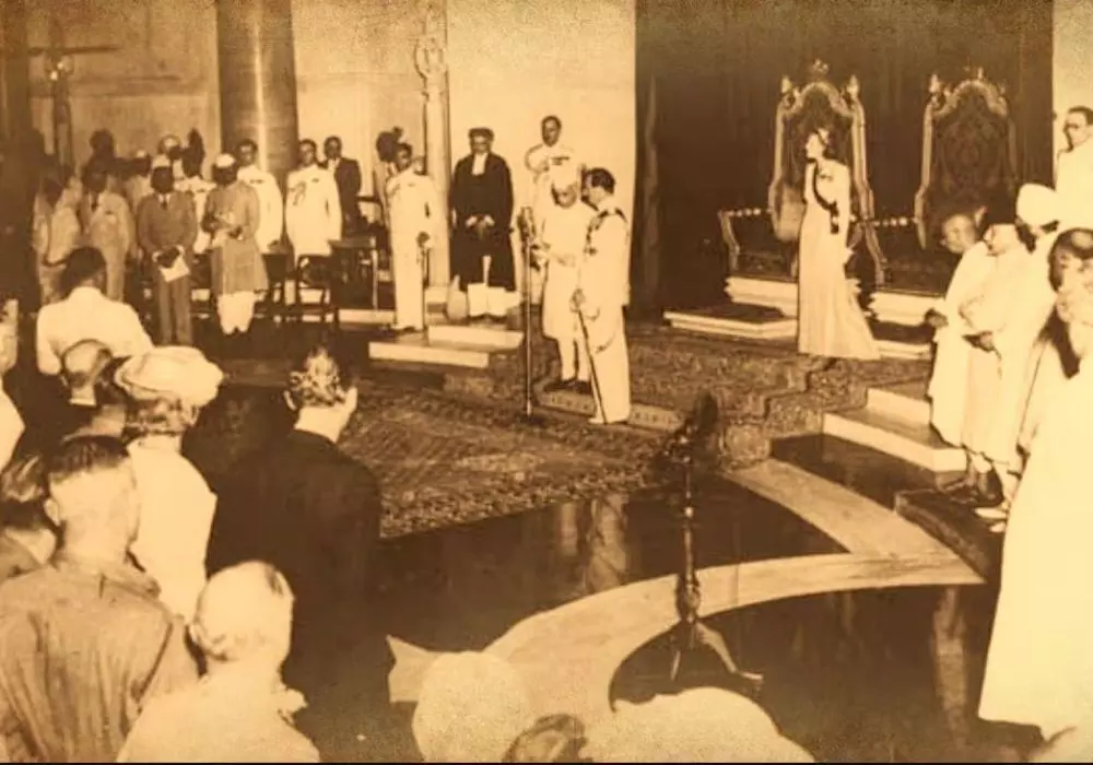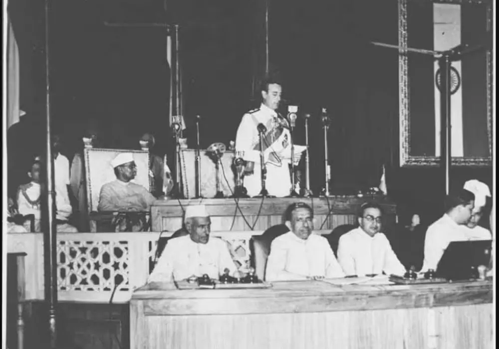 15 अगस्त 1947 को आजादी के बाद सदन में सभी नेताओं की मौजूदगी के बीच वायसराय लुइस माउंटबैटन अपना भाषण देतें हुए। इस सभा का संचालन उस समय डॉ राजेंद्र प्रसाद कर रहे थे।