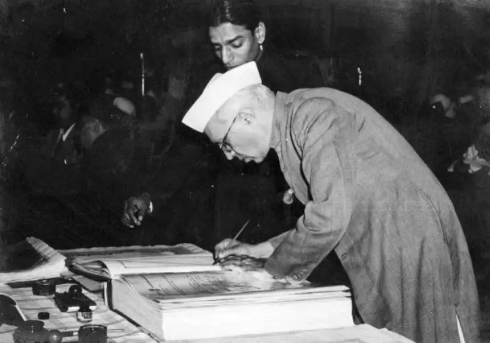 इस तस्वीर में जो दिन है उसका इंतजार पूरा भारत बहुत सालों से कर रहा था। इसमें पीएम नेहरू संविधान पर हस्ताक्षर करते हुए दिखाई दे रहें है। जिसे बनाने में 2 साल 11 महीने और 18 दिन का समय लगा था।