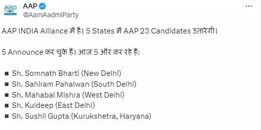 आप ने दिल्ली और हरियाणा में घोषित किए उम्मीदवार, 3 विधायकों को दिया लोकसभा का टिकट