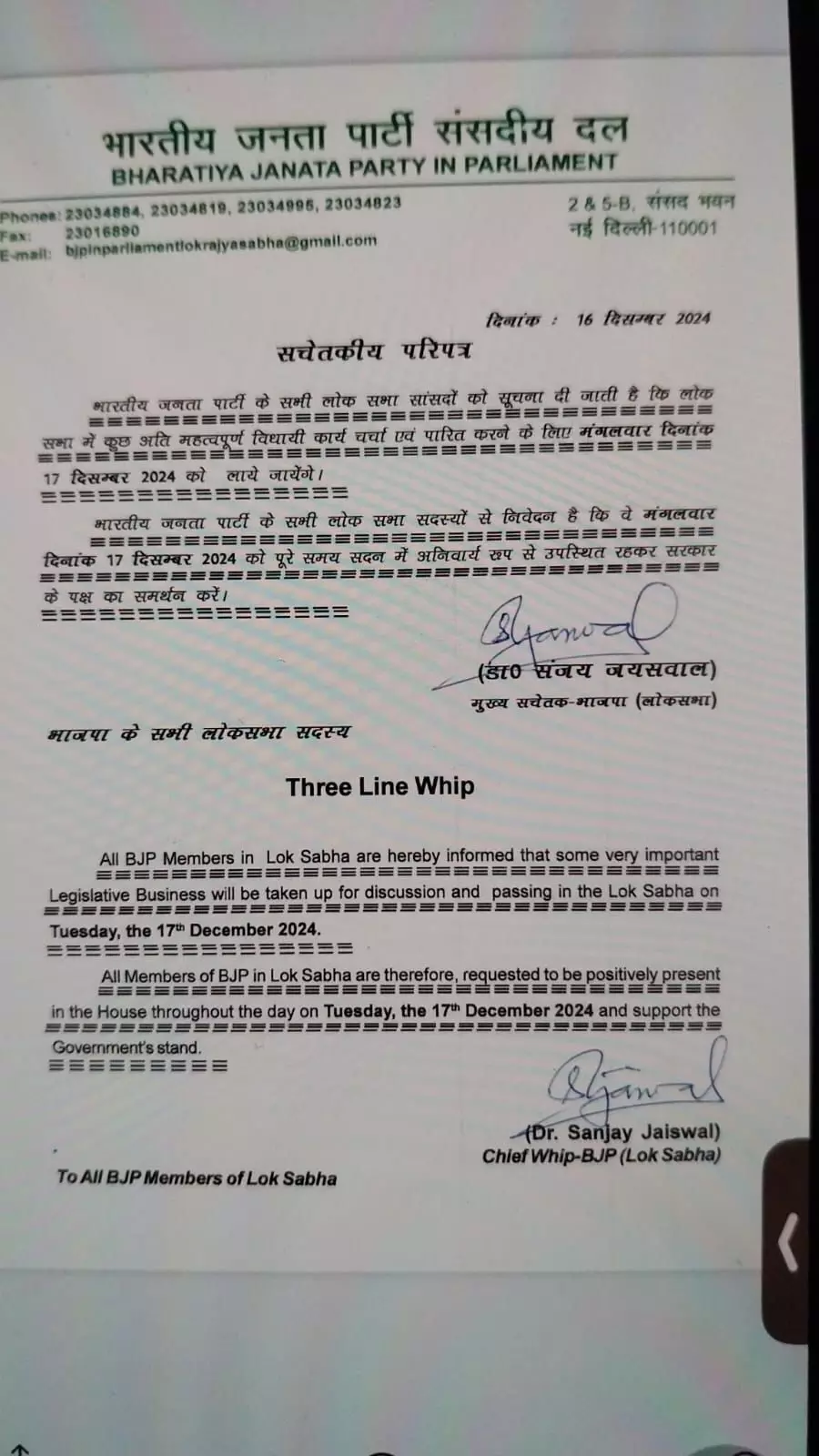 |नई दिल्ली। भाजपा ने सभी सांसदों को तीन लाइन का व्हिप जारी है। 17 दिसंबर को सभी भाजपा सांसदों को सदन में पेश रहने को कहा गया है। माना जा रहा है कि, भाजपा 17 दिसंबर को महत्वपूर्ण बिल पेश कर सकती है। यह बिल वन नेशन वन इलेक्शन से जुड़ा हो सकता है।