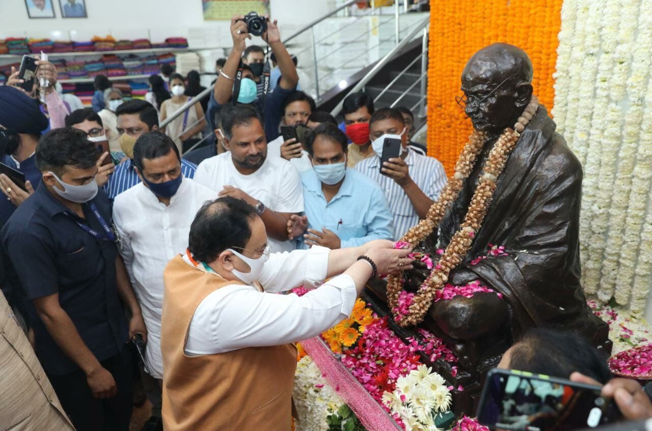 |नई दिल्ली। भारतीय जनता पार्टी (भाजपा) अध्यक्ष जेपी नड्डा ने महात्मा गांधी की जयंती के अवसर पर यहां कनॉट प्लेस स्थित खादी इंडिया का दौरा किया। इस दौरान उन्होंने वहां गांधी की प्रतिमा पर पुष्प अर्पित कर श्रद्धांजलि अर्पित की।
