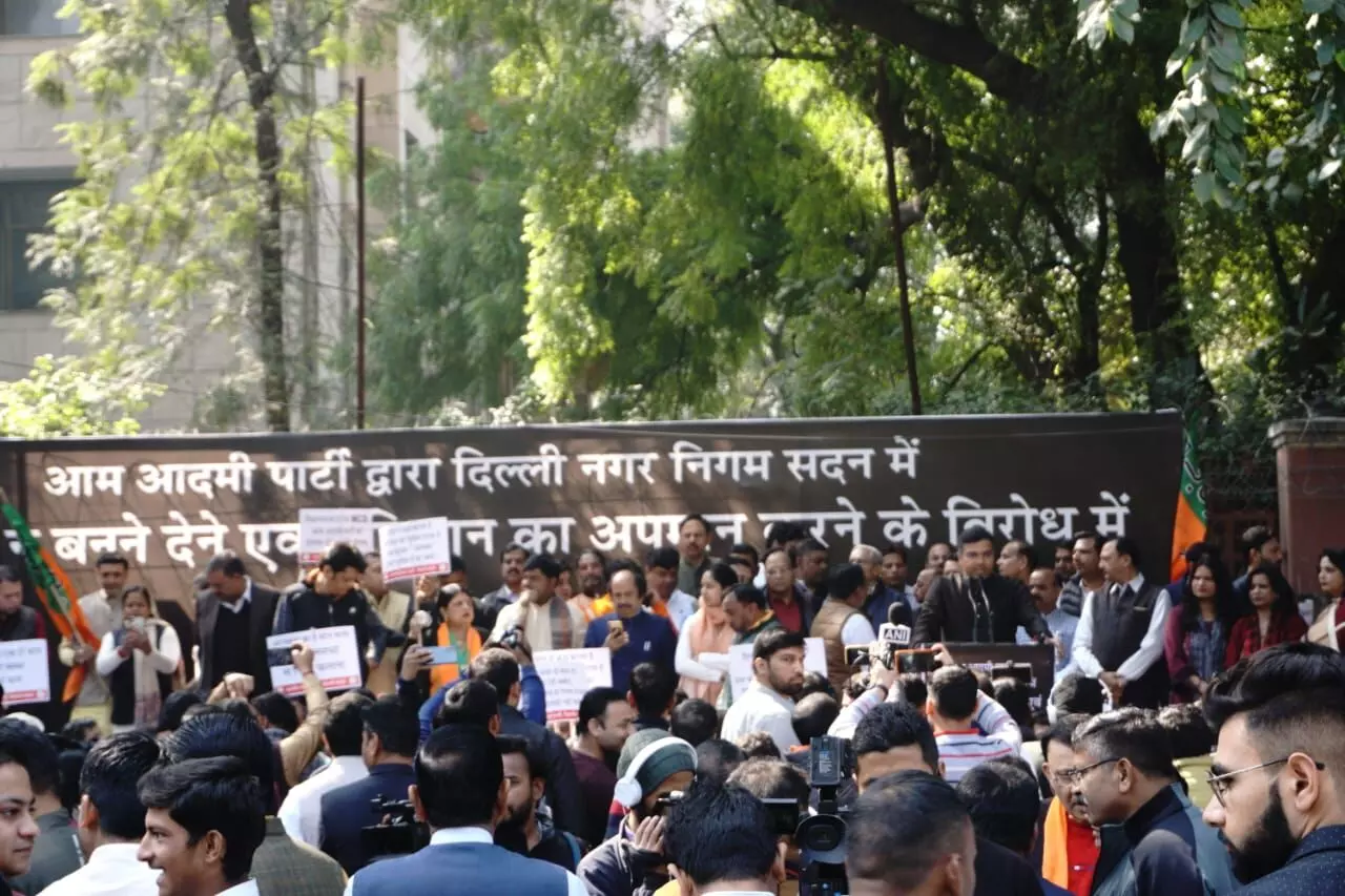 भाजपा ने आप ऑफिस के बाहर किया प्रदर्शन, कहा- मेयर का चुनाव नहीं चाहता सत्ता पक्ष