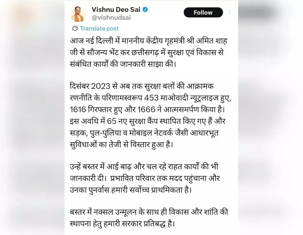 मुख्यमंत्री ने गृहमंत्री को आश्वस्त किया कि माओवाद के पूर्ण उन्मूलन तक अभियान जारी रहेंगे। साथ ही, नक्सल प्रभावित क्षेत्रों में शिक्षा, स्वास्थ्य और रोजगार जैसी सुविधाओं को बढ़ाकर स्थायी शांति स्थापित की जाएगी।
