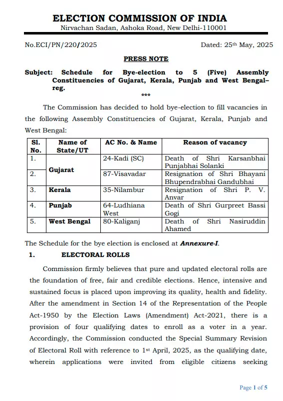 By Election: गुजरात, केरल, पंजाब और पश्चिम बंगाल की 5 विधानसभा सीट पर उपचुनाव का ऐलान