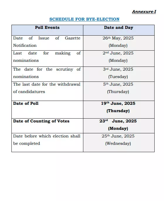 By Election : नई दिल्ली। भारत निर्वाचन आयोग ने गुजरात, केरल, पंजाब और पश्चिम बंगाल के 5 विधानसभा क्षेत्रों के लिए उपचुनाव की तारीख घोषित कर दी है। चुनाव आयोग द्वारा दी गई जानकारी के अनुसार, मतदान की तारीख 19 जून तय की गई है जबकि मतगणना 23 जून को होगी।