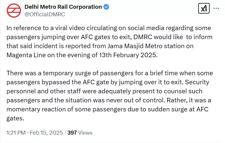 दिल्ली मेट्रो रेल कॉरपोरेशन (डीएमआरसी) ने ट्वीट किया, "कुछ यात्रियों द्वारा एएफसी गेट से बाहर निकलने के लिए कूदने से संबंधित सोशल मीडिया पर प्रसारित एक वायरल वीडियो के संदर्भ में, डीएमआरसी यह सूचित करना चाहता है कि उक्त घटना 13 फरवरी 2025 की शाम को मैजेंटा लाइन पर जामा मस्जिद मेट्रो स्टेशन की है। कुछ यात्रियों द्वारा एएफसी गेट से बाहर निकलने के लिए इसे कूदकर जाने के कारण कुछ समय के लिए यात्रियों की अस्थायी भीड़ उमड़ पड़ी थी। ऐसे यात्रियों को परामर्श देने के लिए सुरक्षाकर्मी और अन्य कर्मचारी पर्याप्त रूप से मौजूद थे। "बल्कि, स्थिति कभी भी नियंत्रण से बाहर नहीं हुई थी, यह एएफसी गेट पर अचानक भीड़ बढ़ने के कारण कुछ यात्रियों की क्षणिक प्रतिक्रिया थी।"