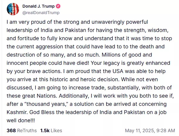 'अमेरिकी राष्ट्रपति डोनाल्ड ट्रंप ने लिखा, 'मुझे भारत और पाकिस्तान के मजबूत और अडिग नेतृत्व पर बहुत गर्व है, क्योंकि उनके पास यह जानने और समझने की शक्ति, बुद्धि और धैर्य है कि वर्तमान आक्रामकता को रोकने का समय आ गया है, जो इतने सारे लोगों की मौत और विनाश का कारण बन सकता है। लाखों अच्छे और निर्दोष लोग मारे जा सकते थे! आपकी विरासत आपके बहादुर कार्यों से बहुत बढ़ गई है।'
