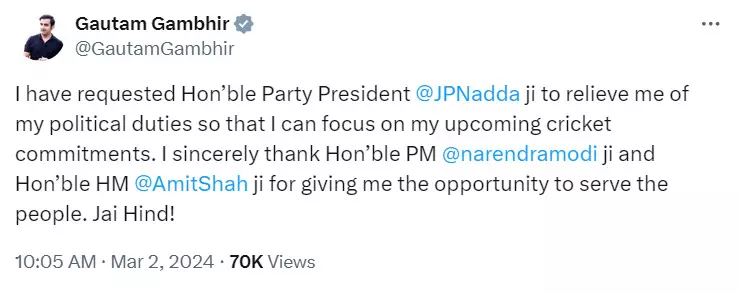 गंभीर ने एक्स (पूर्व में ट्विटर) पर एक पोस्ट में लोगों की सेवा करने की अनुमति देने के लिए प्रधानमंत्री नरेंद्र मोदी और केंद्रीय गृह मंत्री अमित शाह को भी धन्यवाद दिया। उन्होंने शनिवार को एक्स पर लिखा, "मैंने माननीय पार्टी अध्यक्ष जेपी नड्डा जी से मुझे अपने राजनीतिक कर्तव्यों से मुक्त करने का अनुरोध किया है ताकि मैं अपनी आगामी क्रिकेट प्रतिबद्धताओं पर ध्यान केंद्रित कर सकूं। मैं माननीय प्रधान मंत्री नरेंद्र मोदी और माननीय गृह मंत्री अमित शाह को ईमानदारी से धन्यवाद देता हूं, जिन्होंने मुझे लोगों की सेवा करने का अवसर दिया। जय हिंद!''