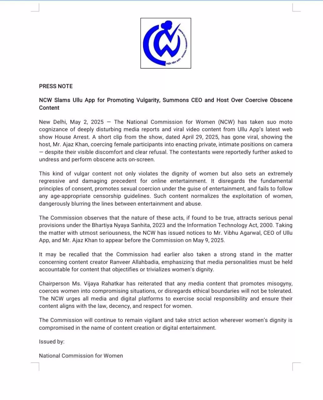 आयोग का मानना है कि, ये कृत्य अगर सत्य पाए जाते हैं, तो भारतीय न्याय संहिता, 2023 और सूचना प्रौद्योगिकी अधिनियम, 2000 के तहत गंभीर दंडात्मक प्रावधानों के तहत कार्रवाई की जाएगी। मामले को अत्यंत गंभीरता से लेते हुए, एनसीडब्ल्यू ने उल्लू ऐप के सीईओ विभु अग्रवाल और एजाज खान को 9 मई को आयोग के समक्ष पेश होने के लिए नोटिस जारी किया है।