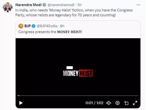 प्रधानमंत्री मोदी ने Money Heist के जरिए कांग्रेस पर कसा तंज, शेयर किया वीडियो