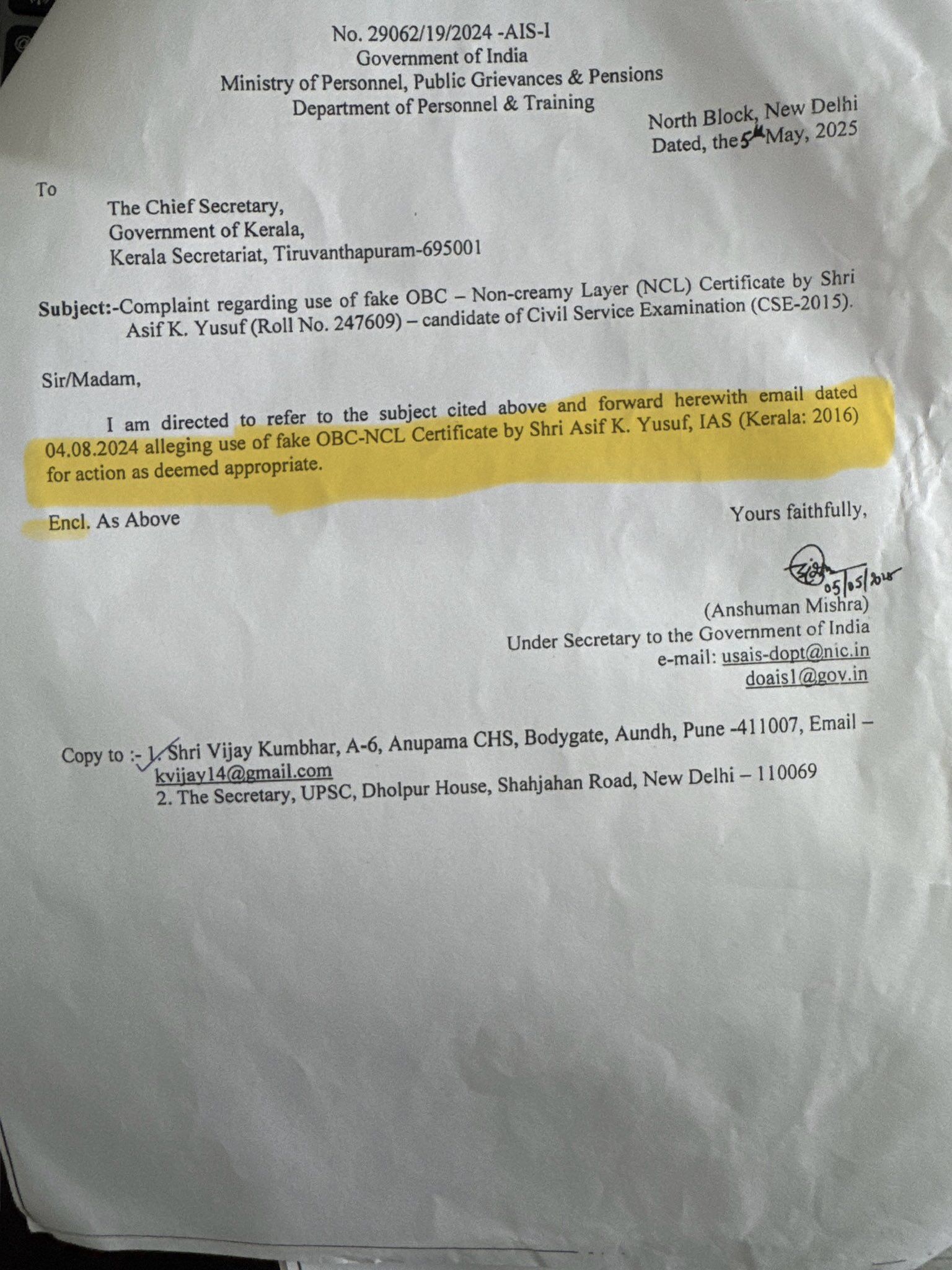 2016 बैच के IAS अधिकारी आसिफ के. यूसुफ ने जाली OBC प्रमाणपत्र का उपयोग करके सेवा में प्रवेश किया था। DoPT ने धोखाधड़ी की पुष्टि की है। DoPT ने केरल सरकार से अनुशासनात्मक कार्रवाई की सिफारिश की है। इस सिफारिश से जुड़ा एक लेटर अब सामने आया है। DoPT ने सुविधाजनक रूप से केरल सरकार से "उचित कार्रवाई" करने के लिए कहा है। गौरतलब है कि, आसिफ केरल के दुग्ध संघ के प्रमुख हैं - पूरे अधिकार के साथ काम कर रहे हैं।IAS Ravi Sihag