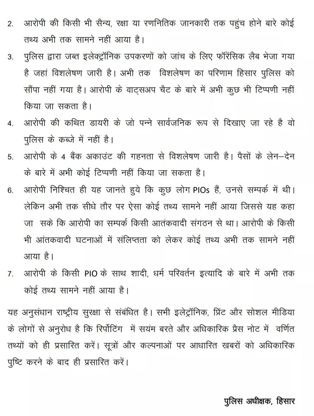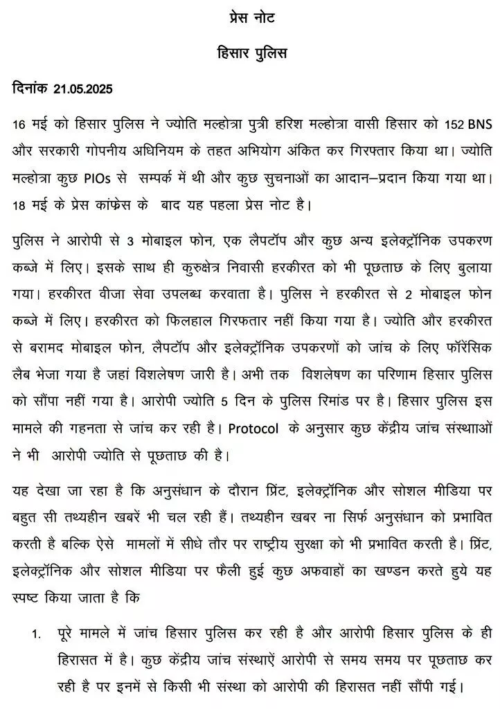 हिसार पुलिस ने प्रेस नोट जारी कर मीडिया में चल रही तथ्यहीन खबरों और अफवाहों का खंडन किया है। पुलिस ने स्पष्ट किया कि, जांच पूरी तरह हिसार पुलिस के अधीन है, और ज्योति हिसार पुलिस की हिरासत में है। केंद्रीय एजेंसियां केवल पूछताछ कर रही हैं, हिरासत किसी को नहीं सौंपी गई है। ज्योति की सैन्य, रक्षा या रणनीतिक जानकारी तक पहुंच के कोई सबूत नहीं मिले हैं।