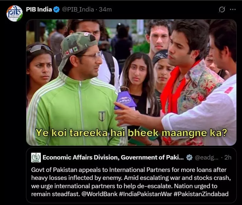 |नई दिल्ली। भारत और पकिस्तान के बीच इस समय तनाव चरम पर है। ऑपरेशन सिन्दूर के तीसरे दिन पाकिस्तान के आर्थिक मामलों मंत्रालय ने एक्स पर पोस्ट करते हुए अधिक लोन की अपील की है। पाकिस्तान सरकार के आर्थिक मामलों के प्रभाग द्वारा भारी घाटे के बाद अधिक ऋण की अपील पर प्रतिक्रिया व्यक्त करते हुए पीआईबी इंडिया ने एक मीम शेयर किया। उन्होंने लिखा कि, "यह कोई तरीका है भीख मांगने का?"