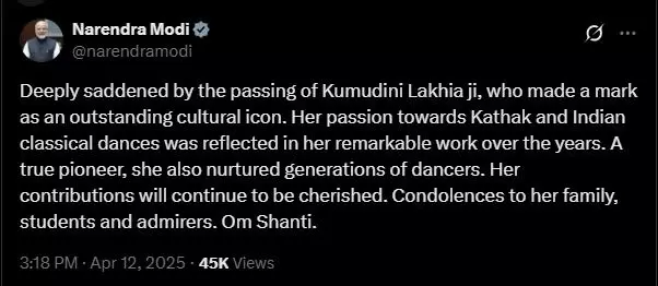 प्रधानमंत्री नरेंद्र मोदी ने एक्स अकाउंट पर पोस्ट साझा की है। इसमें उन्होंने कहा कि, कुमुदिनी लाखिया जी के निधन से बहुत दुःख हुआ, जिन्होंने एक उत्कृष्ट सांस्कृतिक प्रतीक के रूप में अपनी पहचान बनाई। कथक और भारतीय शास्त्रीय नृत्यों के प्रति उनका जुनून पिछले कई वर्षों में उनके उल्लेखनीय कार्यों में झलकता है।