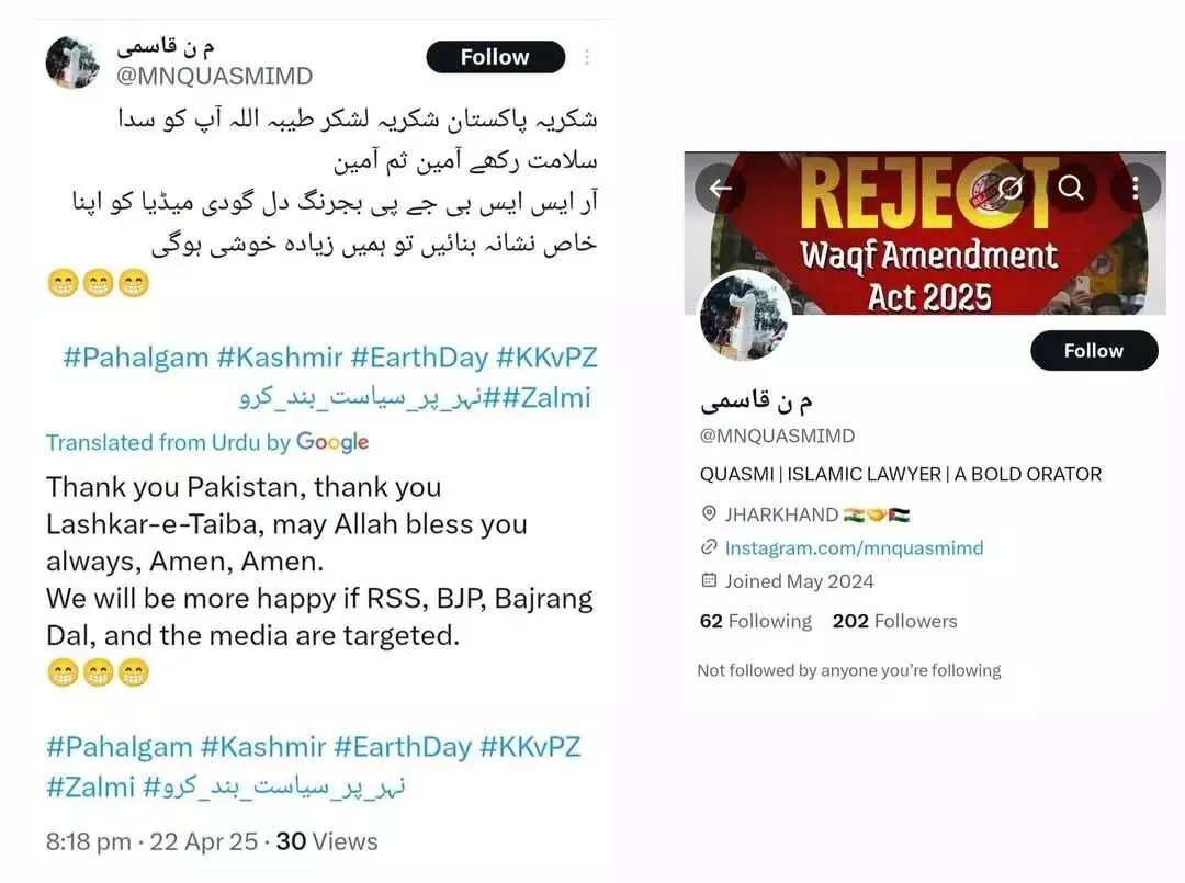 नौशाद ने एक्स पर उर्दू में लिखा, 'शुक्रिया पाकिस्तान, शुक्रिया लश्कर-ए-तैयबा, अल्लाह तुम्हें हमेशा खुश रखे। आमीन, आमीन। हमें ज्यादा खुशी होगी अगर आरएसएस, भाजपा, बजरंग दल और मीडिया को निशाना बनाया जाए।' इसके साथ उसने तीन स्माइली इमोजी के साथ अपनी खुशी भी जाहिर की। उसने इसके बाद भी कई ट्वीट किए जिनमें काफी आपत्तिजनक और भड़काऊं बातें लिखी हैं।