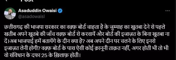 AIMIM के नेता असदुद्दीन औवेसी ने सोशल मीडिया प्लेटफॉर्म X पर पोस्ट साझा करते हुए लिखा कि, छत्तीसगढ़ की भाजपा सरकार का वक़्फ़ बोर्ड चाहता है के जुम्माह का खुतबा देने से पहले खतीब अपने खुतबे की जाँच वक़्फ़ बोर्ड से करवायें और बोर्ड की इजाज़त के बिना खुतबा ना दें।