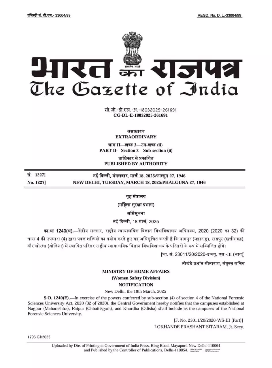 वित्त मंत्री ओपी चौधरी ने कहा कि, केंद्रीय गृह मंत्रालय ने छत्तीसगढ़ की राजधानी रायपुर में स्थापित परिसर को राष्ट्रीय न्यायालयिक विज्ञान विश्वविद्यालय (NFSU) के आधिकारिक परिसर के रूप में अधिसूचित किया है। यह निर्णय फॉरेंसिक शिक्षा, अनुसंधान और जांच क्षमताओं को सशक्त बनाने की दिशा में प्रभावी साबित होगा। प्रधानमंत्री नरेंद्र मोदी एवं गृह मंत्री अमित शाह का आभार।