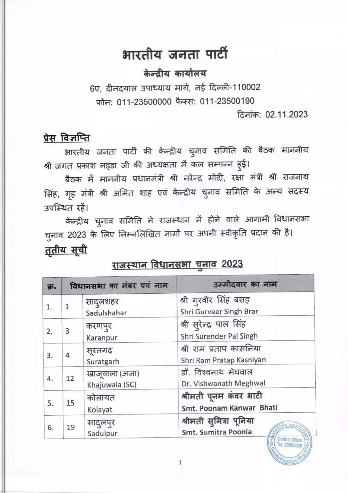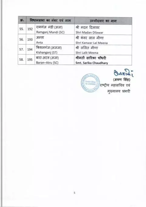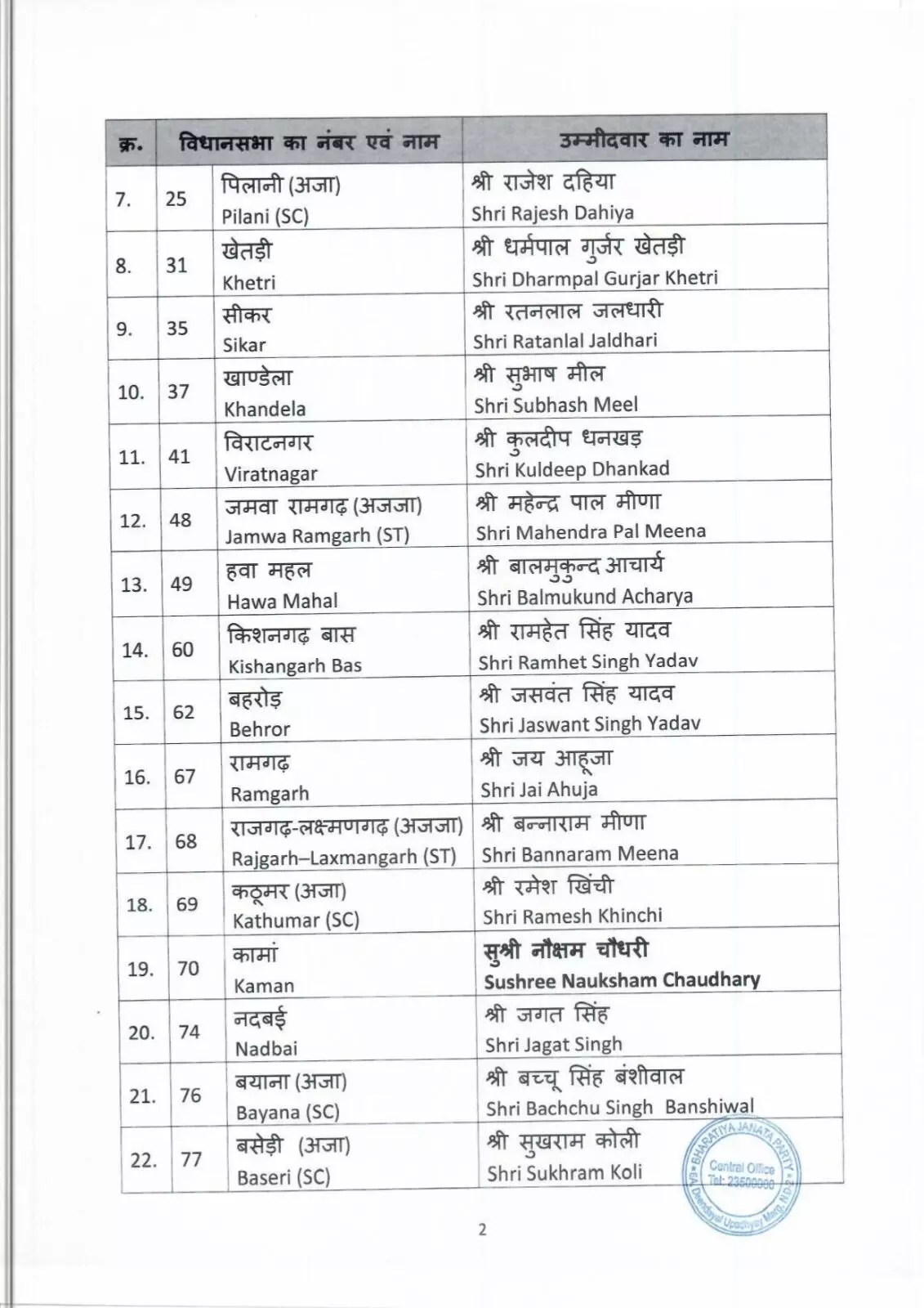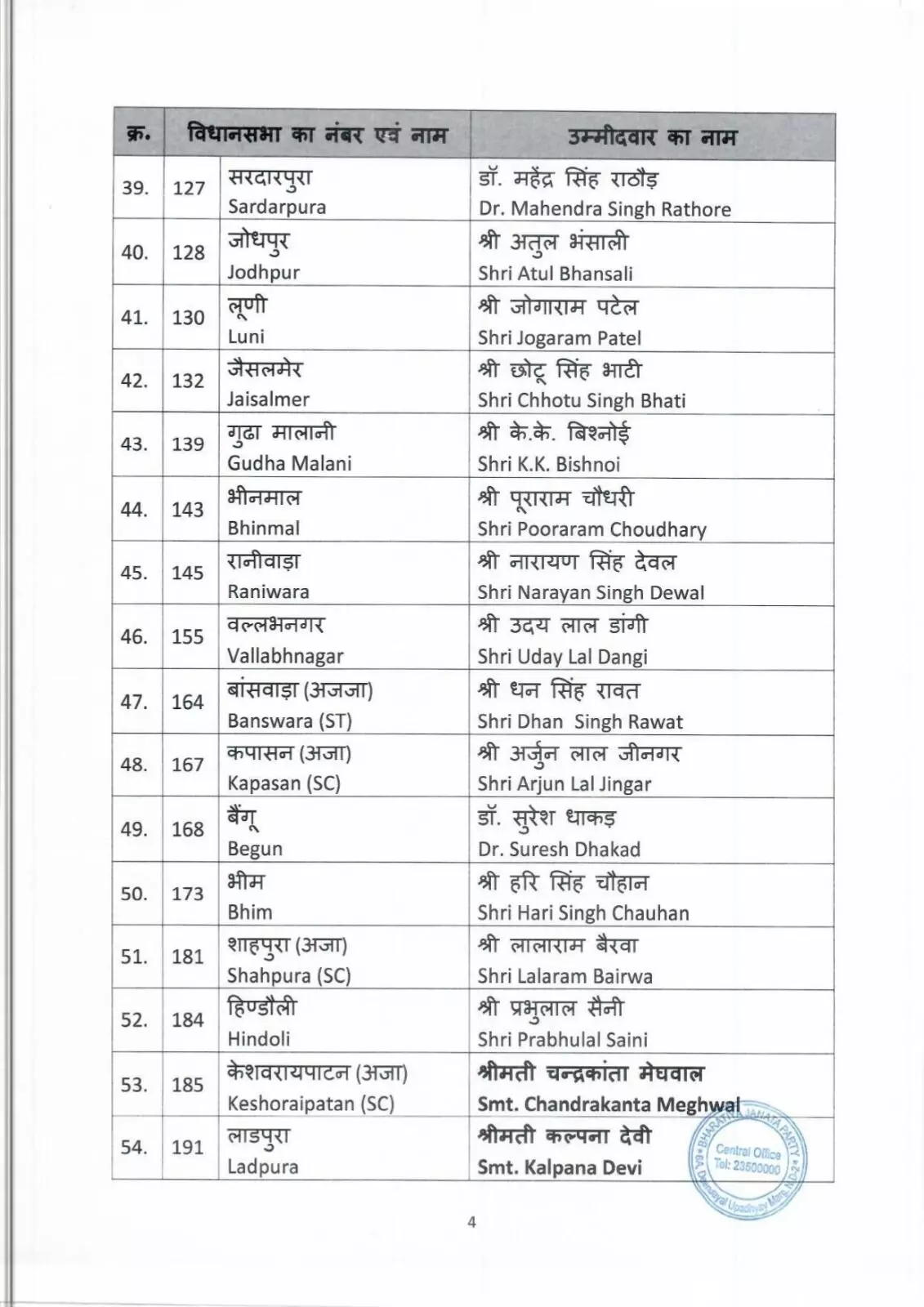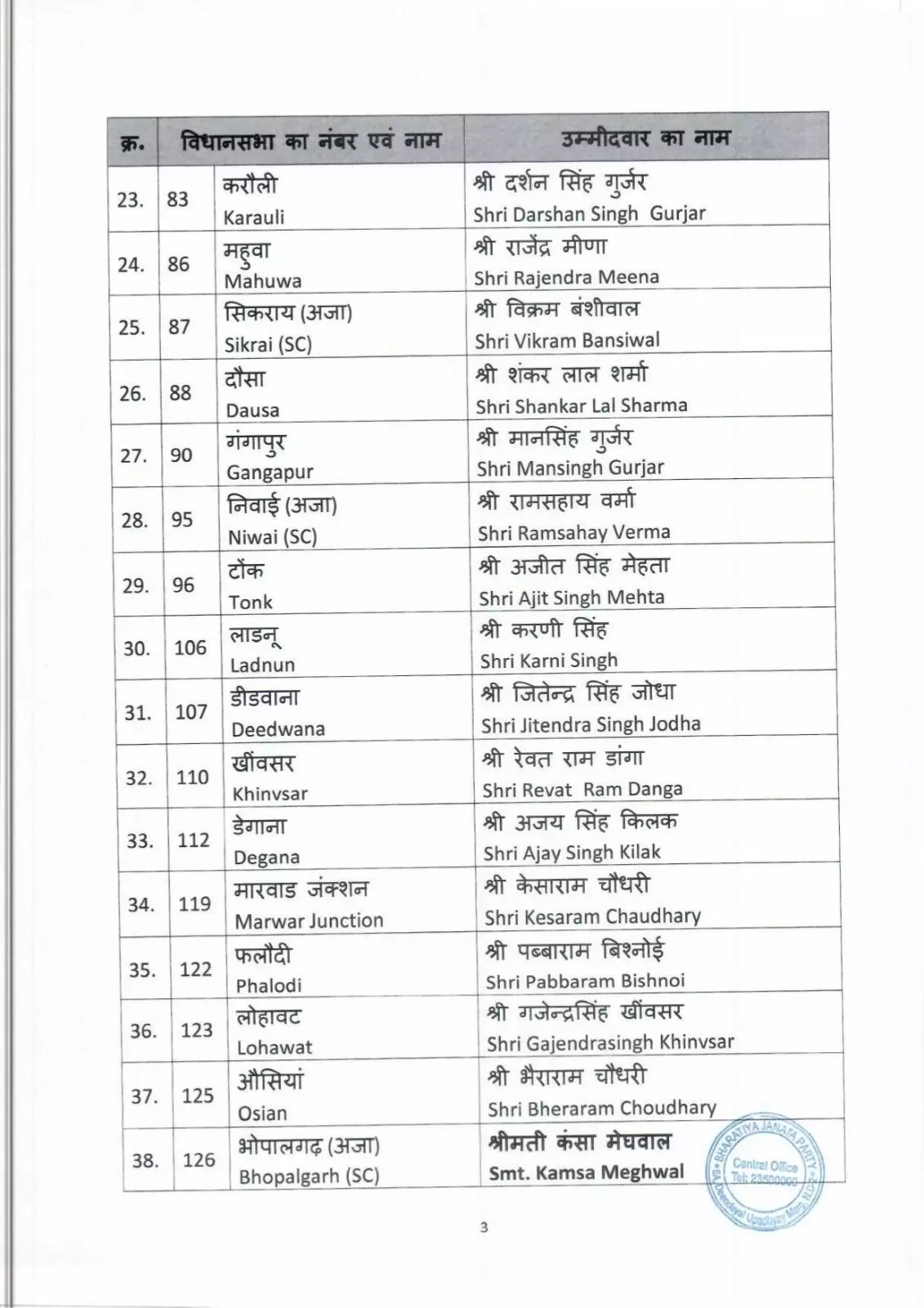 भाजपा की जारी सूची के अनुसार सादुलशहर से गुरवीर सिंह बराड,करणपुर-सुरेंद्र पाल सिंह, सूरतगढ़ रामप्रताप कासनिया, खाजूवाला(अजा)- डॉ. विश्वनाथ मेघवाल,कोलायत-पूनम कंवर भाटी, सादुलपुर- सुमित्रा पूनिया, पिलानी(अजा)- राजेश दहिया, खेतड़ी-धर्मपाल गुर्जर, सीकर-रतनलाल जलधारी, खंडेला-सुभाष मील, विराट नगर-कुलदीप धनखड़, जमवारामगढ(अजजा)- महेंद्र पाल मीणा, हवामहल-बालमुकुंद आचार्य, किशनगढ़बास- रामहेत सिंह यादव, बहरोड़-जसवंत सिंह यादव, रामगढ़-जय आहूजा, राजगढ़-लक्ष्मणगढ़ (अजजा)- बन्ना राम मीणा, कठूमर(अजा)- रमेश खिंची, कामां- जगत सिंह, बयाना(अजा) -बच्चू सिंह बंशीवाल, बसेड़ी(अजा)- सुखराम कोली, करौली- दर्शन सिंह गुर्जर, महवा से राजेंद्र मीणा, सिकराय (अजा) -विक्रम बंशीवाल, दौसा-शंकर लाल शर्मा, गंगापुर-मानसिंह गुर्जर, निवाई(अजा)- रामसहाय वर्मा, टोंक-अजित सिंह मेहता, लाडनूं-करणी सिंह, डीडवाना-जितेंद्र सिंह जोधा,खींवसर-रेवतराम डांगा, डेगाना-अजय सिंह किलक, मारवाड़ जंक्शन- केसाराम चौधरी, फलोदी- पब्बा राम बिश्नोई, लोहावट- गजेंद्र सिंह खींवसर, ओसियां- भैराराम चौधरी, भोपालगढ़(अजा)- कमसा मेघवाल, सरदारपुरा- महेंद्र सिंह राठौड़, जोधपुर-अतुल भंसाली, लूणी- जोगाराम पटेल, जैसलमेर से छोटू सिंह भाटी,गुड़ामालानी- केके बिश्नोई, भीनमाल-पूरा राम चौधरी, रानीवाड़ा-नारायण सिंह देवल, वल्लभनगर-उदयलाल डांगी, बांसवाड़ा(अजजा)-धनसिंह रावत, कपासन(अजा)- अर्जुनलाल जीनगर, बेगूं से सुरेश धाकड़, भीम से हरिसिंह चौहान, शाहपुरा(अजा) -लालाराम बैरवा, हिंडौली-प्रभुलाल सैनी, केशोरायपाटन(अजा)- चंद्रकांता मेघवाल, लाडपुरा-कल्पना देवी, रामगंज मंडी(अजा)- मदन दिलावर, अंता से कंवर लाल मीणा, किशनगंज (अजजा)- ललित मीणा और बारां-अटरू (अजा)- सारिका चौधरी को उम्मीदवार बनाया है।