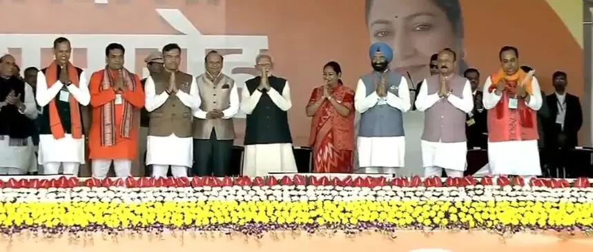 दिल्ली की मनोनीत मुख्यमंत्री रेखा गुप्ता के साथ केंद्रीय मंत्री धर्मेंद्र प्रधान, मध्य प्रदेश के मुख्यमंत्री मोहन यादव, राजस्थान के उपमुख्यमंत्री प्रेम चंद बैरवा और वरिष्ठ भाजपा नेता वसुंधरा राजे भी रामलीला मैदान में शामिल हुईं।
