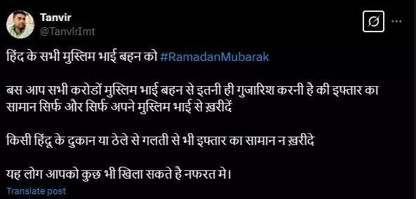 दरअसल, रमज़ान के मौके पर इन दिनों सोशल मीडिया पर एक पोस्ट वायरल हो रहा है। इस पोस्ट में मुसलामानों से रमज़ान में गैर मुसलामानों से कुछ भी खरीदने के लिए मनाही की जा रही है। इसको लेकर बाकायदा सोशल मीडिया एक्स हैंडल पर एक पोस्ट लिखकर साझा की जा रही है। वायरल पोस्ट में लिखा है कि, "हिंद के सभी मुस्लिम भाई बहन को Ramadan Mubarak बस आप सभी करोडों मुस्लिम भाई बहन से इतनी ही गुजारिश करनी है की इफ्तार का सामान सिर्फ और सिर्फ अपने मुस्लिम भाई से ख़रीदें किसी हिंदू के दुकान या ठेले से गलती से भी इफ्तार का सामान न ख़रीदे। यह लोग आपको कुछ भी खिला सकते है नफरत मे।"
