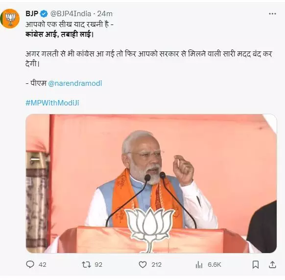 प्रधानमंत्री ने मध्य प्रदेश के सतना में भाजपा की चुनावी सभा को संबोधित किया। उन्होंने कहा कि अभी यहां मतदान में इतने दिन बचे हैं, लेकिन उससे पहले ही झूठ का गुब्बारा फूट गया है। कांग्रेस के पास मध्य प्रदेश के विकास का कोई रोडमैप नहीं है। कांग्रेस के थके-हारे चेहरों में मप्र के युवाओं को कोई भविष्य नहीं दिखता। इसलिए मप्र को भाजपा पर भरोसा है। मप्र को मोदी की गारंटी पर भरोसा है।