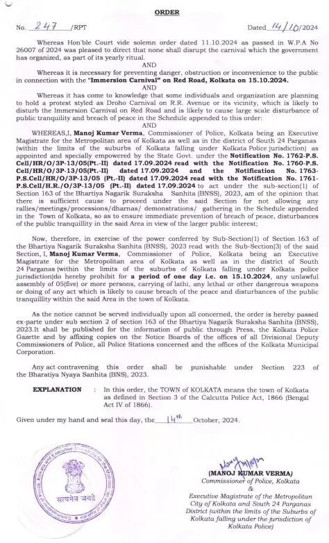 |Section 163 of BNSS implemented in Kolkata : पश्चिम बंगाल। कोलकाता में दुर्गा पूजा के बीच पुलिस प्रशासन ने सुरक्षा को बढ़ा दिया है। दुर्गा पूजा कार्निवाल के दौरान संभावित घमासान को देखते हुए कोलकाता पुलिस ने एक दिन के लिए भारतीय नागरिक सुरक्षा संहिता की धारा 163 लागू कर दी है। इसके तहत रेड रोड के आस-पास के इलाकों में किसी तरह की रैली या पांच लोगों से ज्यादा लोगों के एकजुट होने पर प्रतिबंध रहेगा।
