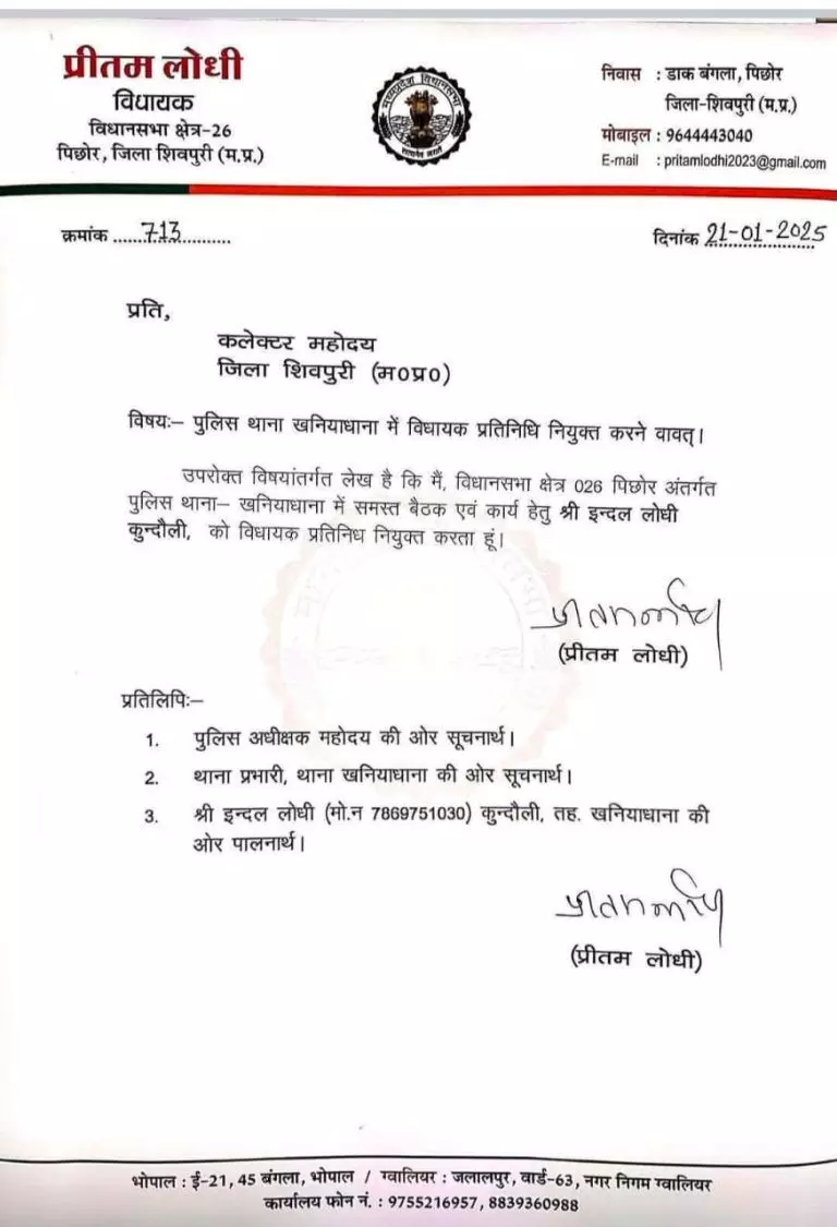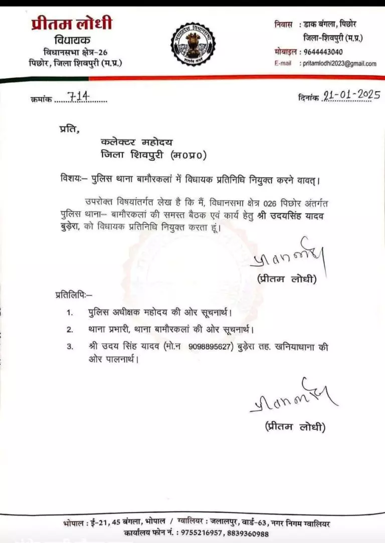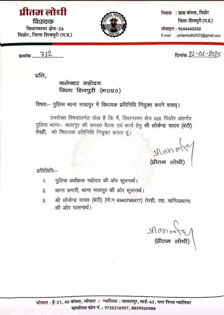 Shivpuri MLA Pritam Lodhi Appoints Representatives at Police Stations : शिवपुरी। मध्य प्रदेश के शिवपुरी जिले के पिछोर से बीजेपी विधायक प्रीतम लोधी एक बार फिर चर्चा में हैं। इस बार उन्होंने ऐसा कारनामा किया है, जिसने सभी को चौंका दिया है। दरअसल, विधायक प्रीतम लोधी (MLA Pritam Lodhi) ने थाने के लिए प्रतिनिधि को नियुक्त किया है। इसके लिए विधायक द्वारा नियुक्ति पत्र भी जारी कर दिया गया है। बता दें कि, ऐसा पहली बार है जब किसी विधायक ने थाने के लिए प्रतिनिधि नियुक्त किया हो।