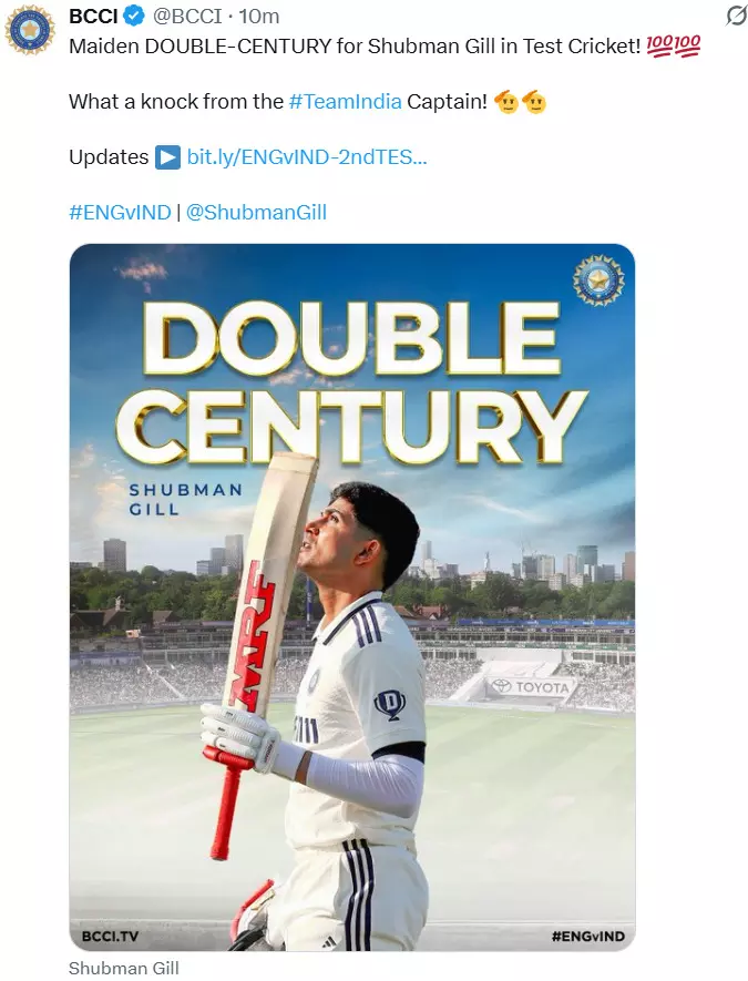 |𝗔 𝗺𝗮𝗶𝗱𝗲𝗻 𝗧𝗲𝘀𝘁 𝗱𝗼𝘂𝗯𝗹𝗲 𝗰𝗲𝗻𝘁𝘂𝗿𝘆: भारतीय टेस्ट टीम के नए कप्तान शुभमन गिल ने इंग्लैंड के खिलाफ चल रही सीरीज में जबरदस्त फॉर्म जारी रखते हुए इतिहास रच दिया। बर्मिंघम टेस्ट में गिल ने अपने करियर का पहला दोहरा शतक जड़ दिया। उन्होंने 311 गेंदों में 21 चौकों और 2 छक्कों की मदद से ये उपलब्धि हासिल की। कप्तान बनने के बाद गिल का यह लगातार दूसरा शतक है।
