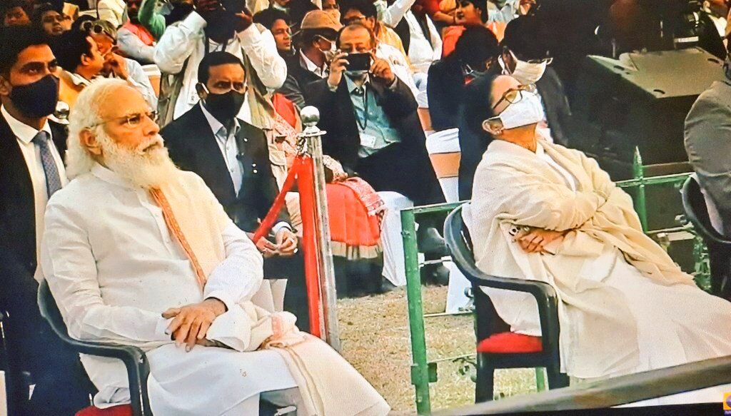 इस आयोजन में जब राज्य की मुख्यमंत्री ममता बनर्जी के बोलने की बारी आई तो वहां उपस्थित लोग जोर-जोर से जय श्री राम के नारे लगाने लगे। जिसके बाद ममता बनर्जी ने मंच से कहा कि 'ये सरकार का कार्यक्रम है और इसकी गरिमा होनी चाहिए। इसपर किसी राजनीतिक रंग को न चढ़ाया जाए क्योंकि ये किसी राजनीतिक दल का कार्यक्रम नहीं है। मैं पीएम मोदी और सांस्कृतिक मंत्रालय की आभारी हूं लेकिन किसी को निमंत्रित करके उसे बेइज्जत करना आपको शोभा नहीं देता है।' इतना कहकर वह मंच से वापस आकर अपनी सीट पर बैठ गईं जबकि उनका पांच मिनट तक भाषण का समय था।