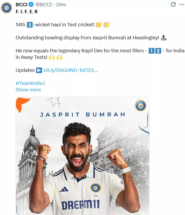 लीड्स टेस्ट में 5 विकेट झटककर जसप्रीत बुमराह ने एक बड़ा रिकॉर्ड अपने नाम किया। बुमराह अब विदेशी धरती पर भारत के लिए सबसे ज्यादा बार 5 विकेट लेने वाले गेंदबाजों की सूची में कपिल देव के साथ संयुक्त रूप से पहले स्थान पर आ गए हैं। बुमराह ने यह उपलब्धि केवल 64 पारियों में हासिल की, जबकि कपिल देव को इस मुकाम तक पहुंचने में 108 पारियां लगी थीं। SENA देशों में भी बुमराह अब 10 बार 5 विकेट ले चुके हैं, जिससे वह वहां सबसे ज्यादा बार ऐसा करने वाले संयुक्त रूप से दूसरे एशियाई गेंदबाज बन चुके हैं।