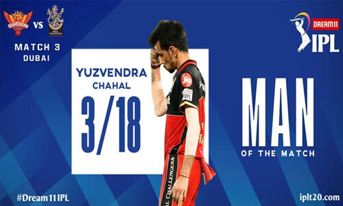 |नई दिल्ली। आईपीएल के 13वें सीजन के तीसरे मैच में रॉयल चैलेंजर्स बैंगलोर (आरसीबी) ने सनराइजर्स हैदराबाद (एसआरएच) को 10 रनों से हराया। एक समय ऐसा लगने लगा था कि एसआरएच आसानी से यह मैच जीत लेगा, लेकिन इसके बाद युजवेंद्र चहल ने अपनी गेंदबाजी से मैच रुख पूरी तरह से पलट दिया। जॉनी बेयरेस्टो ने 43 गेंद पर 61 रनों की पारी खेली, जबकि मनीष पांडे ने 33 गेंद पर 34 रन बनाए। चहल ने इन दोनों बल्लेबाजों को आउट किया, इसके अलावा विजय शंकर को भी पवेलियन का रास्ता दिखाया।