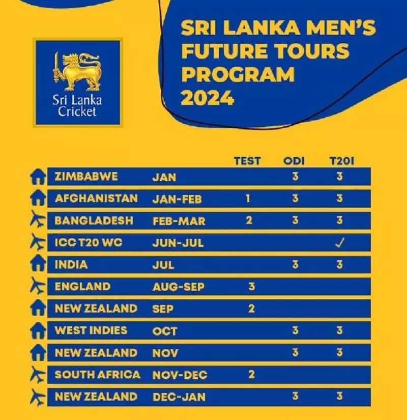 एसएलसी ने एक आधिकारिक बयान में कहा, "श्रीलंका की राष्ट्रीय टीम अपने 2024 अंतरराष्ट्रीय क्रिकेट कैलेंडर की शुरुआत जनवरी में जिम्बाब्वे के खिलाफ एक घरेलू श्रृंखला के साथ करेगी, जिसमें तीन एकदिवसीय और तीन टी20ई श्रृंखलाएं शामिल होंगी। इसके बाद जनवरी-फरवरी की अवधि के दौरान अफगानिस्तान के खिलाफ एक श्रृंखला होगी, जिसमें एक टेस्ट मैच, तीन वनडे और तीन टी20ई, मैच शामिल हैं।"