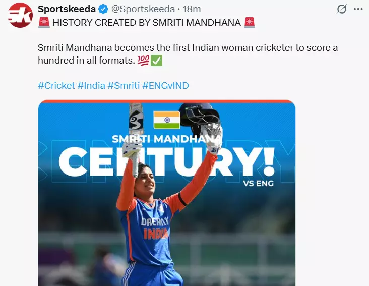 तीनों फॉर्मेट में शतक जड़ने वाली पहली भारतीय महिला क्रिकेटर बनीं मंधाना