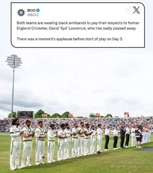 |who was David 'Syd' Lawrence: भारत और इंग्लैंड के बीच 5 मैचों की टेस्ट सीरीज का पहला मैच 20 जून से खेला जा रहा है, जिसका आज तीसरा दिन है। पहले दिन दोनों टीमों ने अहमदाबाद में हुए विमान हादसे में मारे गए लोगों को श्रद्धांजलि देने के लिए काली पट्टी बांधी थी। हैरानी की बात यह है कि तीसरे दिन भी खिलाड़ी काली पट्टी बांधकर मैदान पर उतरे। ऐसे में सवाल उठता है कि इसके पीछे क्या वजह है? आइए जानते हैं इसके पीछे की असली वजह।