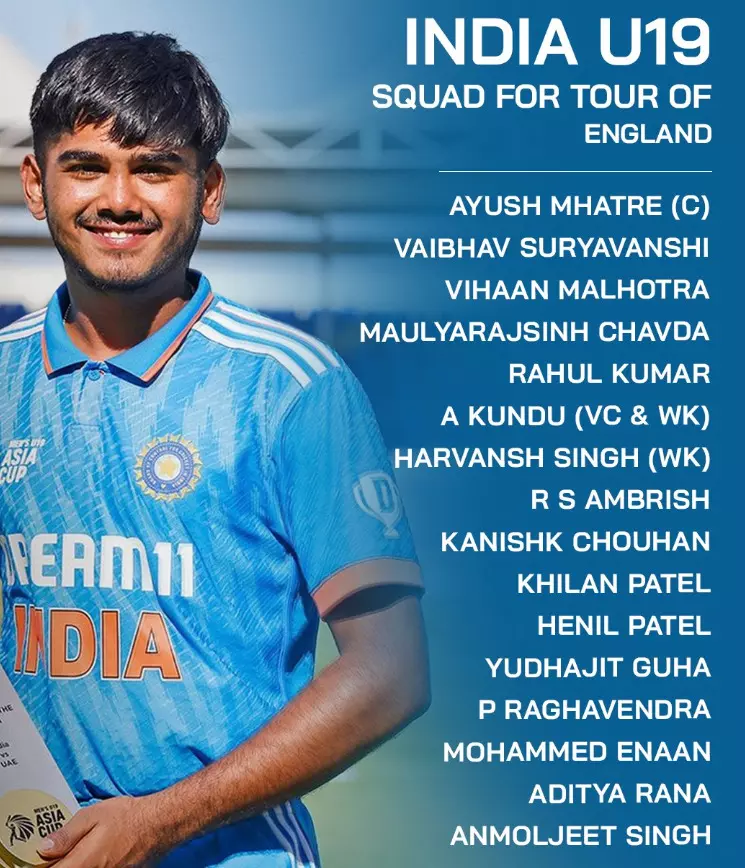 |India U19 squad for Tour of England 2025: जून में भारतीय सीनियर टीम के इंग्लैंड दौरे के साथ-साथ भारत की अंडर-19 टीम भी उसी महीने इंग्लैंड का दौरा करेगी। बीसीसीआई ने इस सीरीज के लिए स्क्वॉड का ऐलान कर दिया है। आईपीएल 2025 में चेन्नई सुपर किंग्स की ओर से खेलने वाले आयुष म्हात्रे को टीम की कमान सौंपी गई है। वहीं 14 साल के वैभव सूर्यवंशी को भी टीम में शामिल किया गया है। सूर्यवंशी ने राजस्थान रॉयल्स की ओर से खेलते हुए महज 35 गेंदों में शतक जड़कर इतिहास रच दिया था, जो किसी भी भारतीय खिलाड़ी द्वारा आईपीएल का सबसे तेज शतक है।