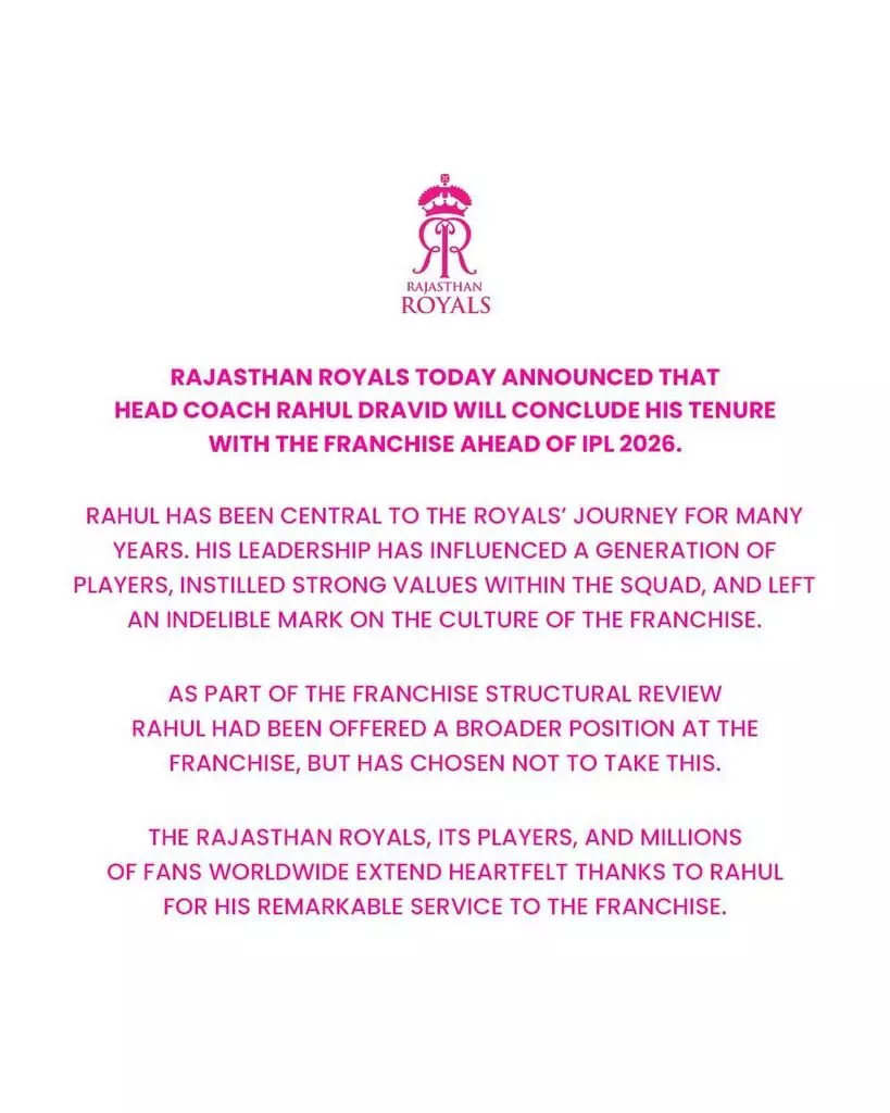 IPL 2025: राजस्थान रॉयल्स के हेड कोच पद से राहुल द्रविड़ का इस्तीफ़ा, फ्रेंचाइज़ी ने X पर की पुष्टि
