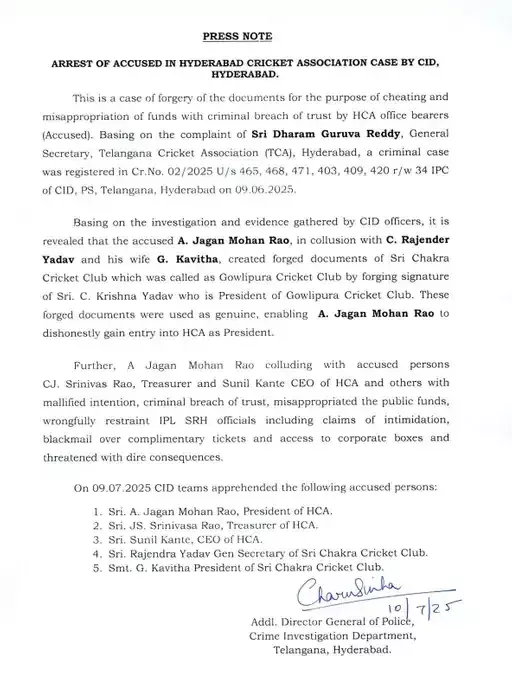तेलंगाना सीआईडी ने हैदराबाद क्रिकेट एसोसिएशन (HCA) में आर्थिक गड़बड़ियों को लेकर बड़ी कार्रवाई करते हुए अध्यक्ष ए. जगन मोहन राव समेत चार अन्य को गिरफ्तार किया है। यह कार्रवाई इंडियन प्रीमियर लीग (IPL) की फ्रेंचाइज़ी सनराइजर्स हैदराबाद की ओर से दर्ज कराई गई शिकायत के आधार पर की गई, जिसमें HCA पर वित्तीय अनियमितता और कुप्रबंधन जैसे गंभीर आरोप लगाए गए थे।
