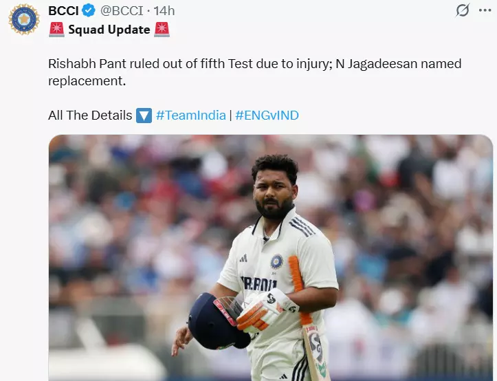 |Anderson Tendulkar Trophy 2025: टीम इंडिया को इंग्लैंड के खिलाफ टेस्ट सीरीज के पांचवें मुकाबले से पहले बड़ा झटका लगा है। प्रमुख विकेटकीपर बल्लेबाज ऋषभ पंत चोट के कारण अंतिम टेस्ट से बाहर हो गए हैं। उनकी गैरमौजूदगी में तमिलनाडु के विकेटकीपर नारायण जगदीशन को टीम में शामिल किया गया है।