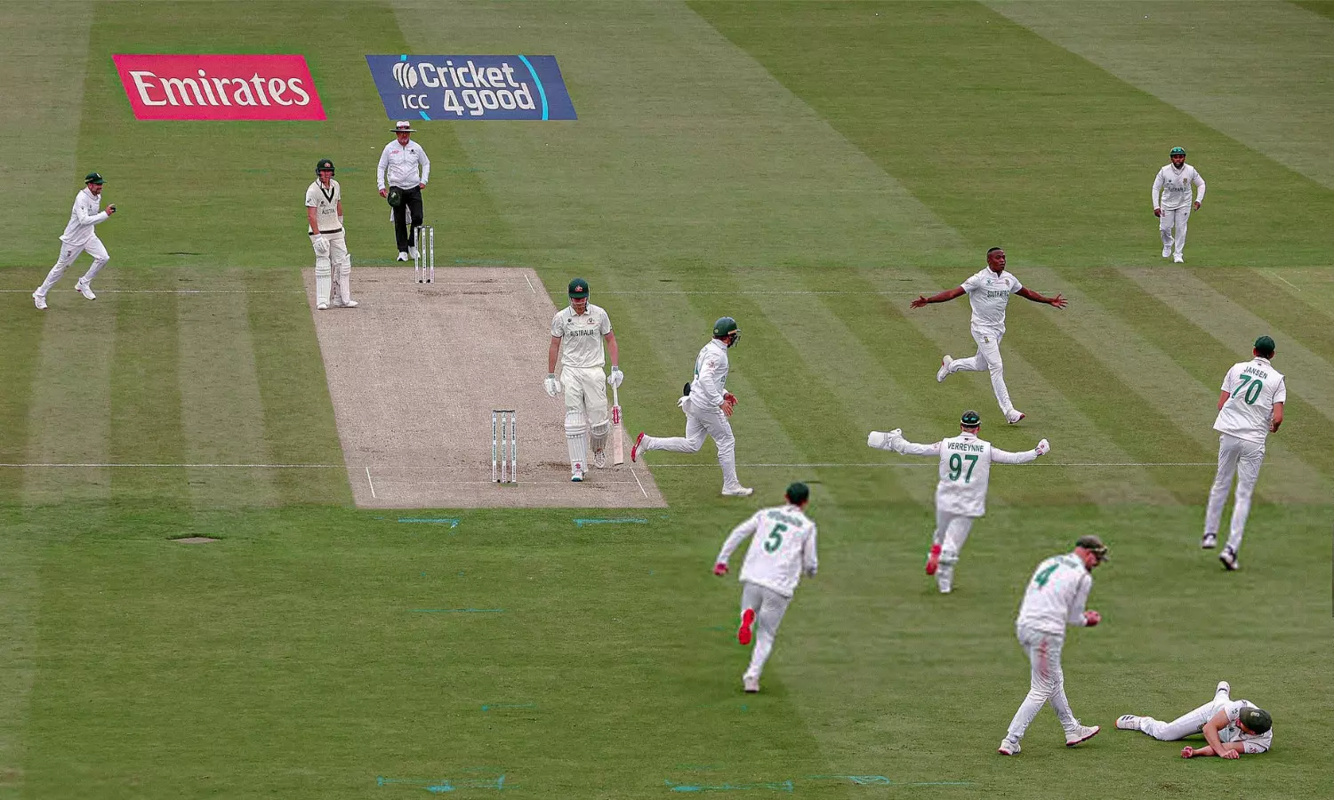 साउथ अफ्रीका ने टॉस जीतकर पहले गेंदबाजी का फैसला लिया, जो टीम के लिए फायदेमंद साबित हुआ। ऑस्ट्रेलिया की पहली पारी 212 रन पर सिमट गई। ब्यू वेबस्टर ने 72 और स्टीव स्मिथ ने 66 रन की अहम पारियां खेलीं, जबकि विकेटकीपर एलेक्स कैरी सिर्फ 23 रन ही बना सके। साउथ अफ्रीका के लिए कगिसो रबाडा ने शानदार गेंदबाजी करते हुए 5 विकेट झटके। वहीं मार्को यानसन ने 3 सफलताएं हासिल कीं।