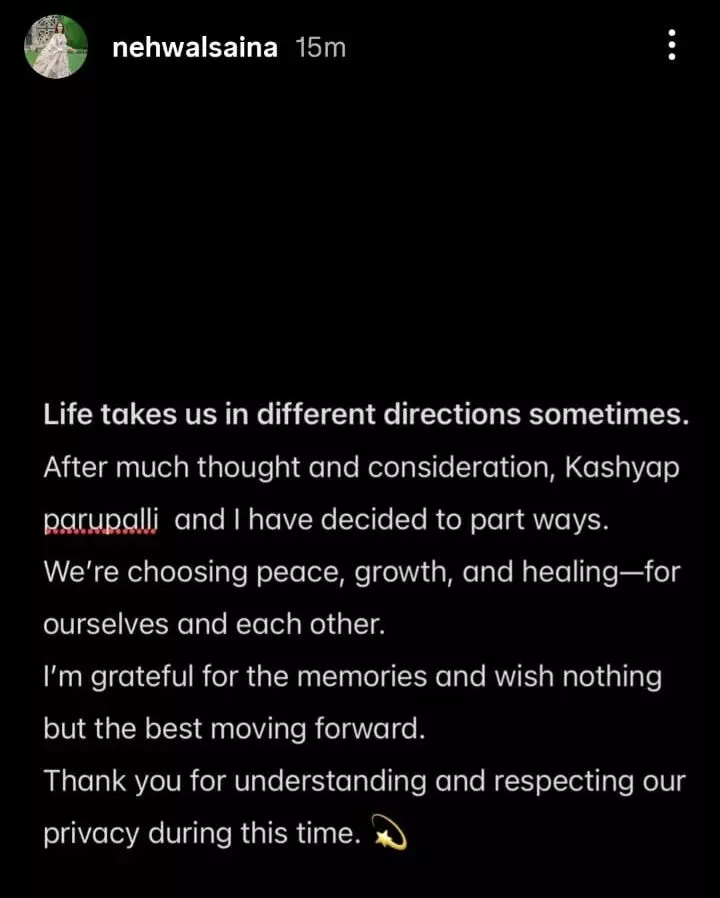 अपने अलगाव के फैसले को लेकर साइना नेहवाल ने सोशल मीडिया पर एक भावुक पोस्ट साझा की। उन्होंने लिखा, "जिंदगी हमें कभी-कभी अलग दिशाओं में ले जाती है। बहुत सोच-विचार के बाद कश्यप पारुपल्ली और मैंने अलग होने का फैसला किया है। हम अपने और एक-दूसरे के लिए शांति, विकास और उपचार का विकल्प चुन रहे हैं। मैं उन यादों के लिए आभारी हूं और आगे के लिए शुभकामनाएं देती हूं।" साथ ही साइना ने फैंस और मीडिया से उनकी निजता का सम्मान करने की अपील भी की।